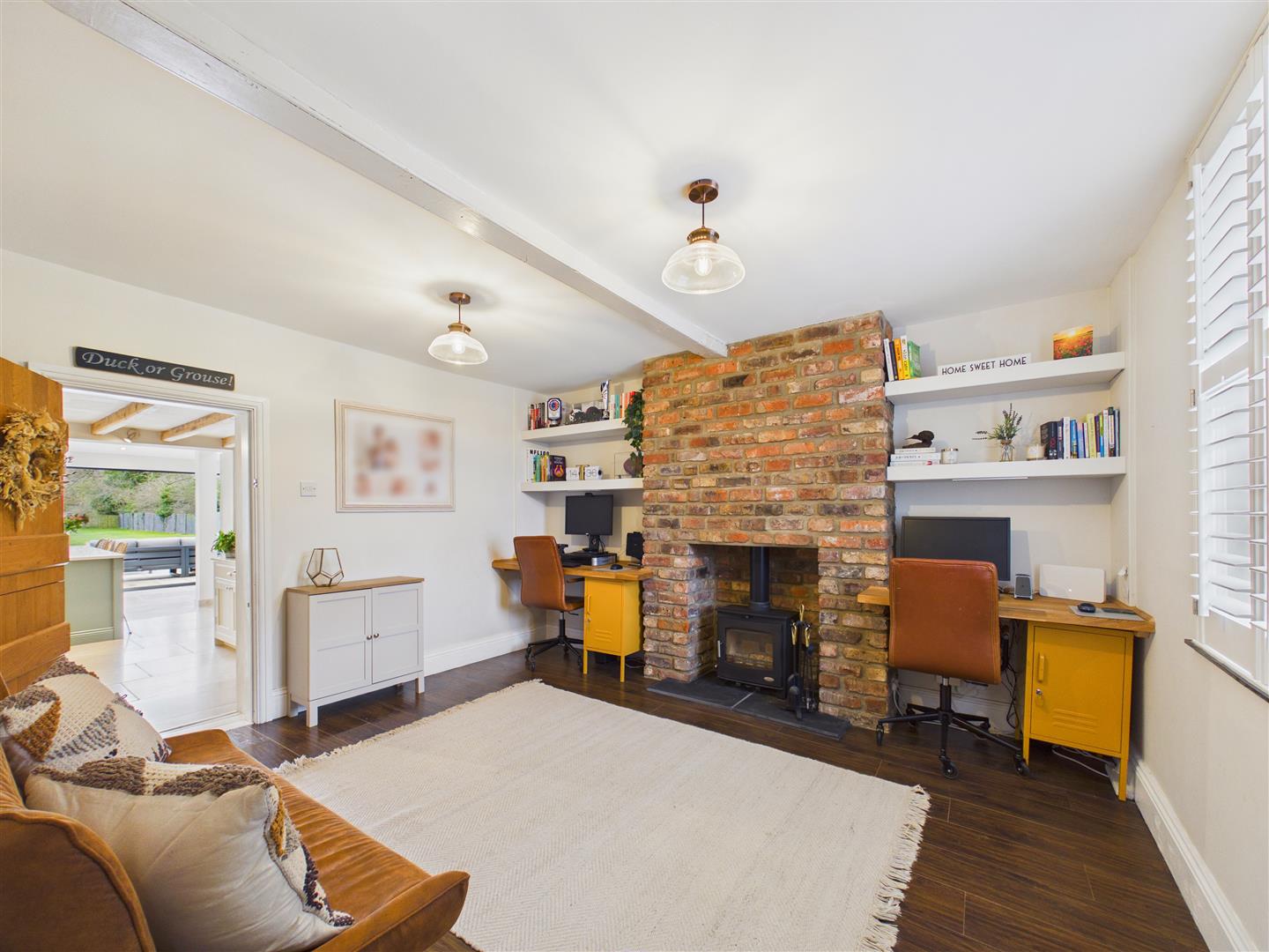Office/Sitting Room - With exposed brick chimney breask housing a log burning stove upon a tiled hearth. Window to the front elevation with plantation shutters.
