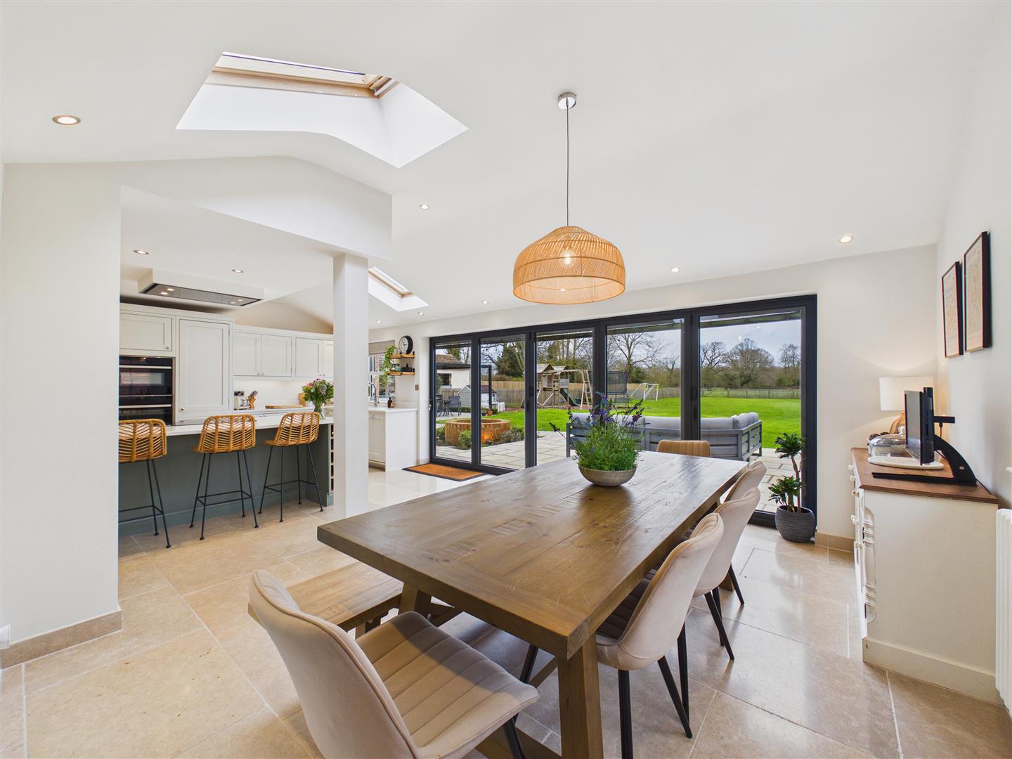 The heart of this home has been beautifully re-modelled for contemporary life. The stunning dining kitchen is a masterclass in design, featuring sleek quartz worktops, a central island, and bi-folding doors that dissolve the boundary between the interior and the garden. It is a space built for the realities of family life, supported by a substantial utility/boot room-essential for country living-and three versatile reception rooms.