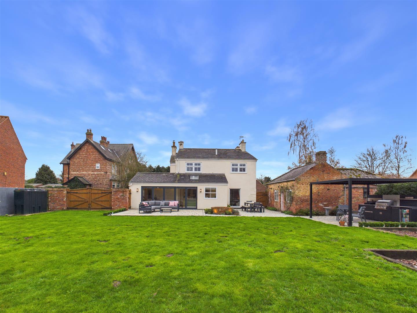 The Villa: A stunning 4-bed period home in Laxton set within 2.2 acres. Featuring a designer quartz kitchen with bi-folds, an expansive outdoor kitchen, and a private grazing paddock with stables. Includes brick outbuildings with huge holiday-let potential. The perfect blend of luxury and land.