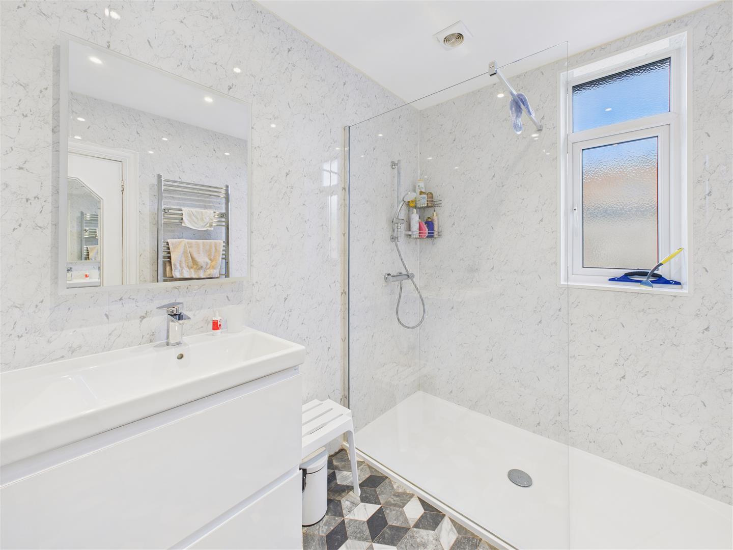 Shower Room - With large shower cubicle, wash hand basin in cabinet.