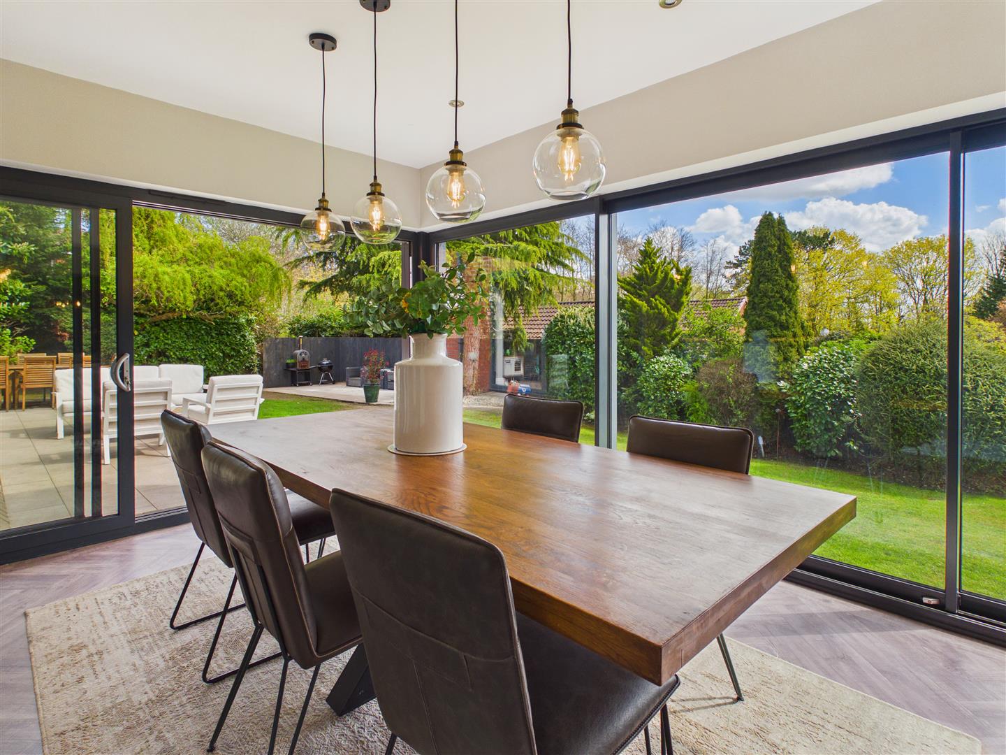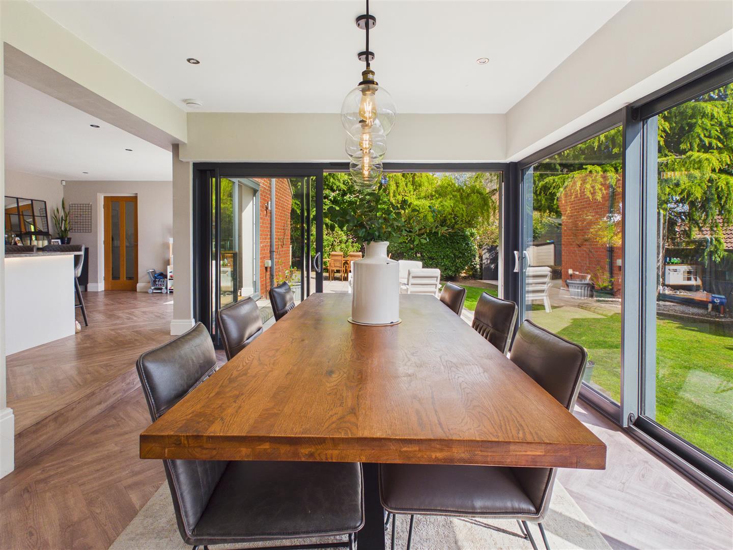 Dining Area - With a wall of sliding glazing to 2 sides, providing views across a garden and access out to the terrace.