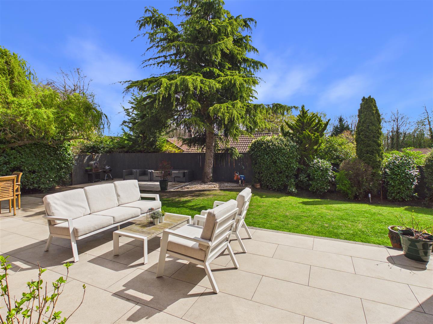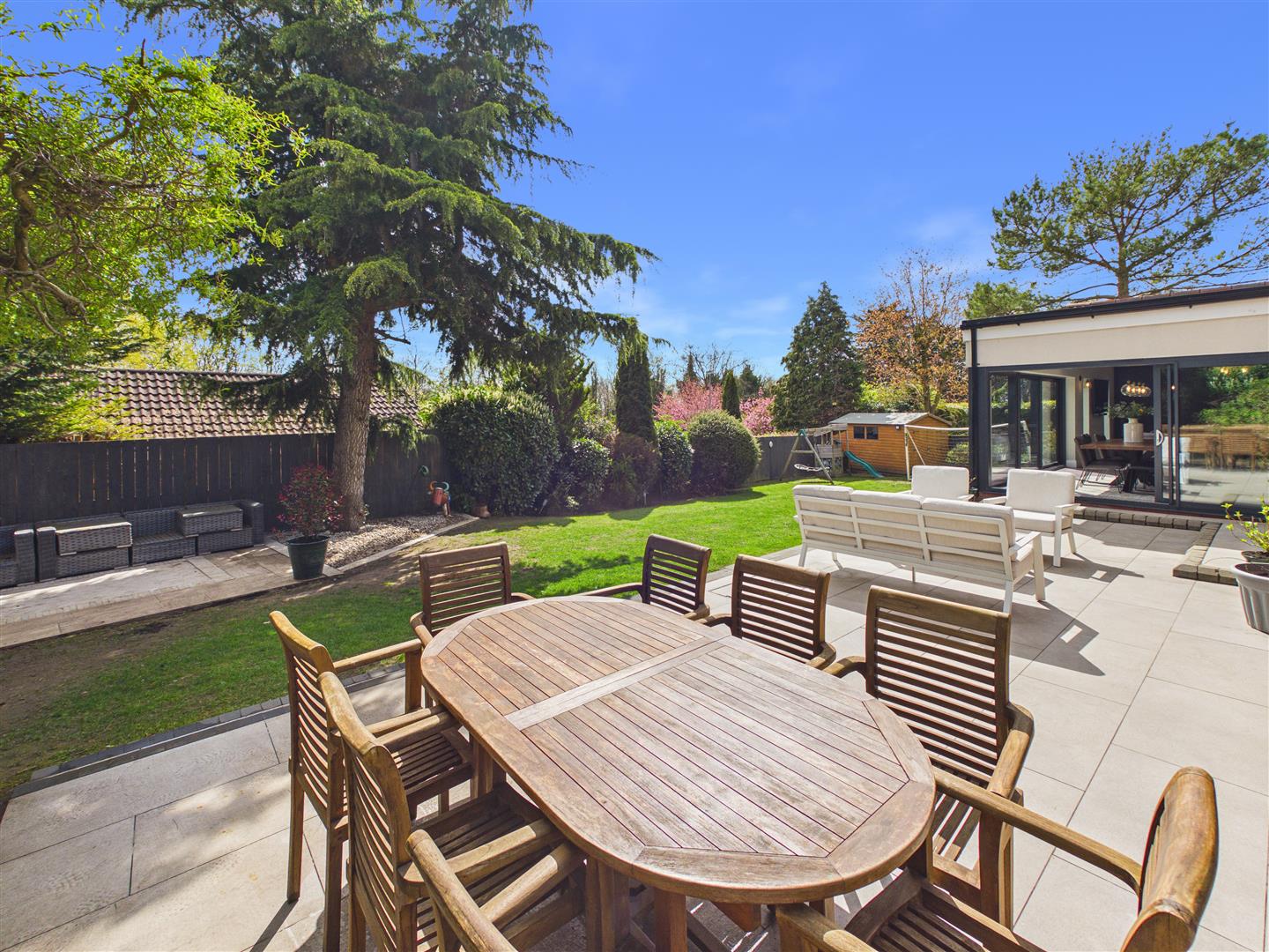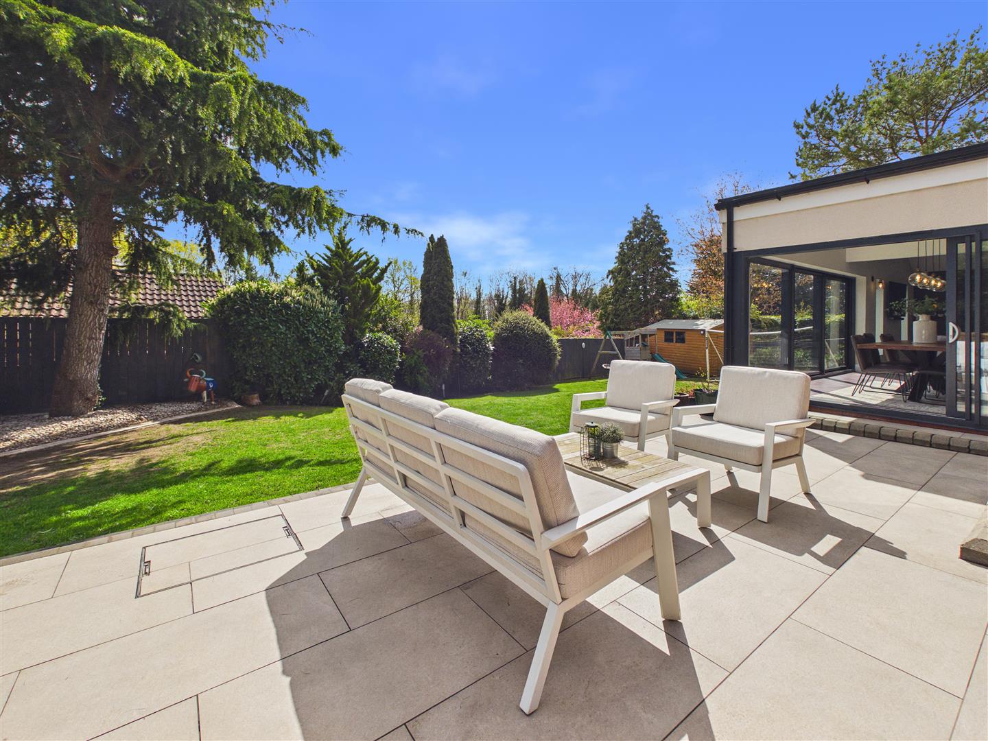 Outside - The property has an open plan lawned garden to the front, adjacent to which is a generous forecourt which provides multiple parking. There is a gated access to the side, which itself is block set with raised beds and access to a shed. The southernly facing rear garden incorporates a professionally landscaped large terrace with steps down to the lawn and further patio to one corner to enjoy the evening sun. There is also another large garden shed.