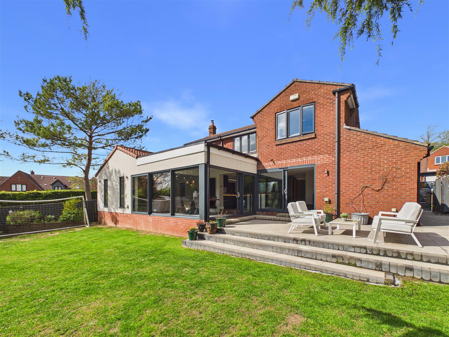 This outstanding property affords highly desirable contemporary living in a sought after location. The stunning accommodation has been significantly extended by the current owners to create a fabulous family home, at its centre is an amazing open plan living/dining room with a breakfast kitchen. There is also an impressive study/gym currently utilised as a golf studio by the owner. The cosy lounge features a log burner and practicalities are catered for by a large utility room and cloak/boot room. Originally built with a 4 bedroomed design, a previous owner enhanced the main bedroom by amalgamating it with bedroom 4 to create a dressing room, an alteration that the owner undertakes to reverse prior to completion (unless, of course, a purchaser prefers the current layout). There is a stylish en-suite to bedroom 1 and a stunning main bathroom. The accommodation has the benefit of gas fired central heating to radiators and uPVC double glazing. Underfloor heating is provided to the extended open plan living/dining area. The property stands in a good sized plot with driveway providing good parking and access to the double garage. The gardens have been landscaped and to the rear enjoy a southernly aspect with a large paved terraced lawn beyond and a further patio to one corner. In all, a fabulous home in a very popular residential area.